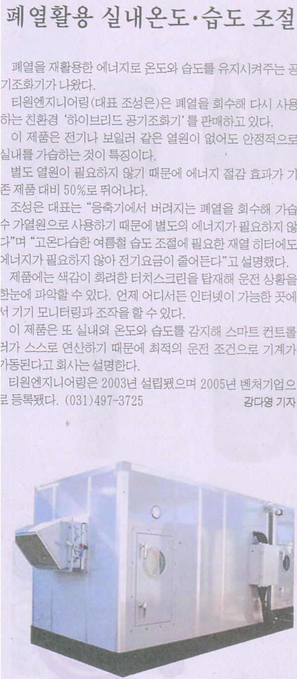 매경 신문 기사 발췌(폐열 활용 종조 시스템) 페이지 정보 작성자 티원엔지니어링 작성일18-12-13 11:49 조회2,428회 이전글 목록 본문 폐열회수 하이브리드 공조시스템 관련(주)티원엔지니어링 관련 기사입니다. 이전글 목록