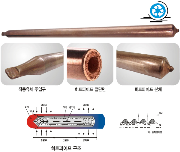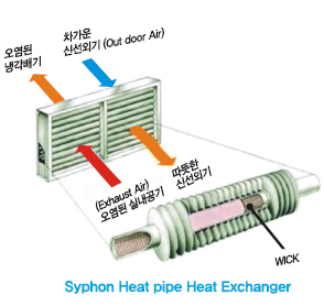 열은 높은 곳에서 낮은 곳으로 이동하는 자연현상을 이용한 친환경 히트파이프 회수장치를 채택한 설비 시스템이다.